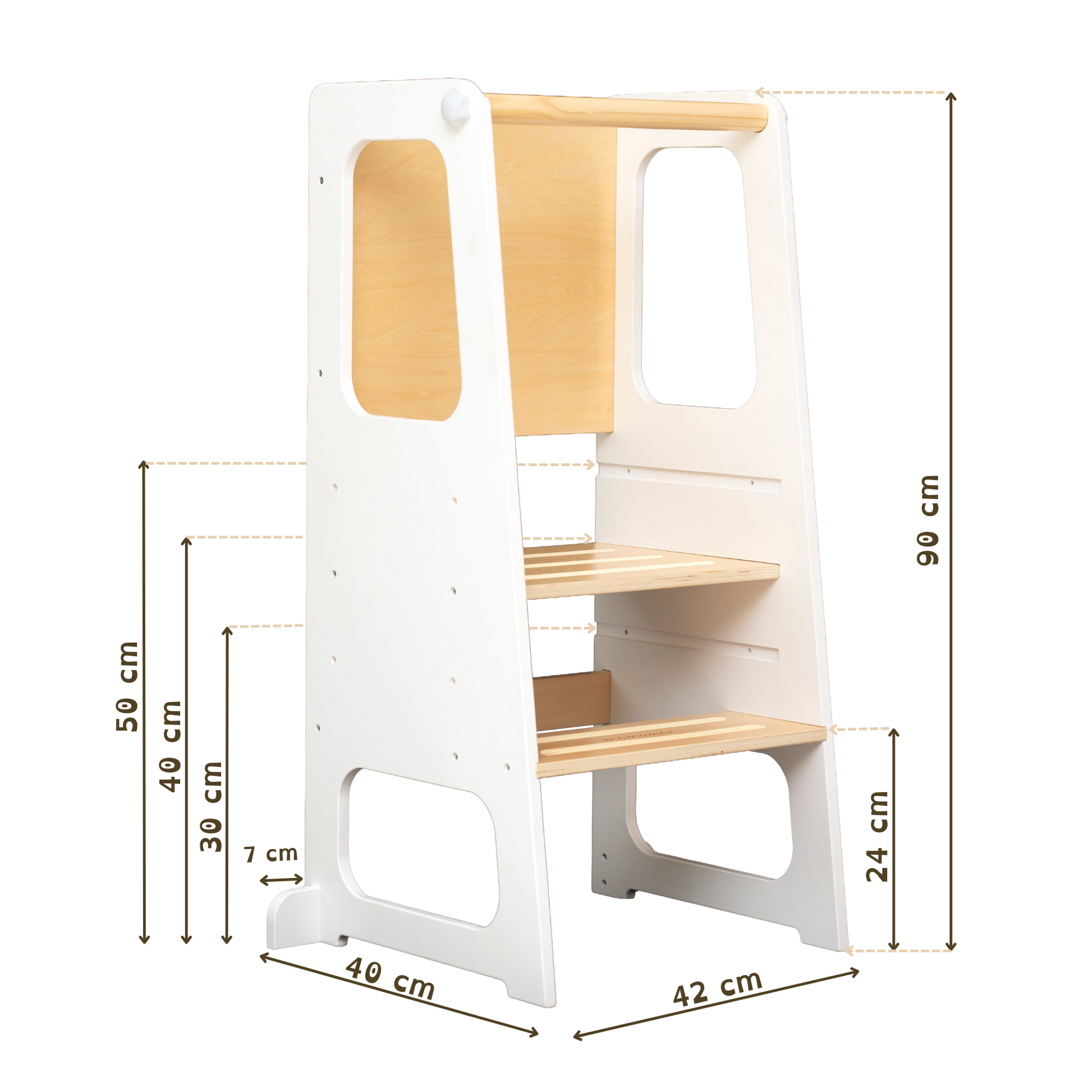 Torre montessori de 3 alturas ajustables para ir adaptandose a las diferentes etapas desde bebés hasta niños y niñas de 6 a 7 años. Seguridad con una barra de extraíble sin necesidad de herramientas y tiras antiderrapantes además de 2 soportes para evitar movimientos laterales.